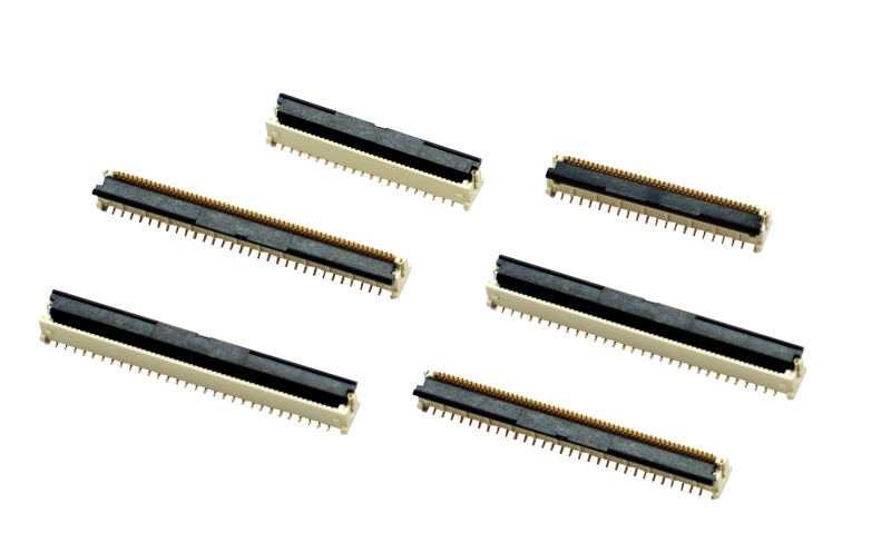 ◆ 該系列產(chǎn)品高度4.6mm,厚度4.2mm,間距為0.5mm的緊湊超強度設計,采用ZIF方式,帶鎖條立貼。端子引腳采用Z字形排列, 配備有正腳位與反腳位。