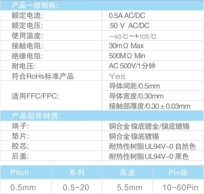 ◆ 該系列產(chǎn)品高度5.5mm,厚度3.2mm 間距為0.5mm的緊湊設計,采用ZIF方式,帶鎖條立貼。端子引腳采用Z 字形排列,